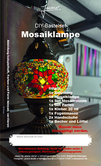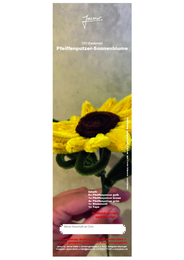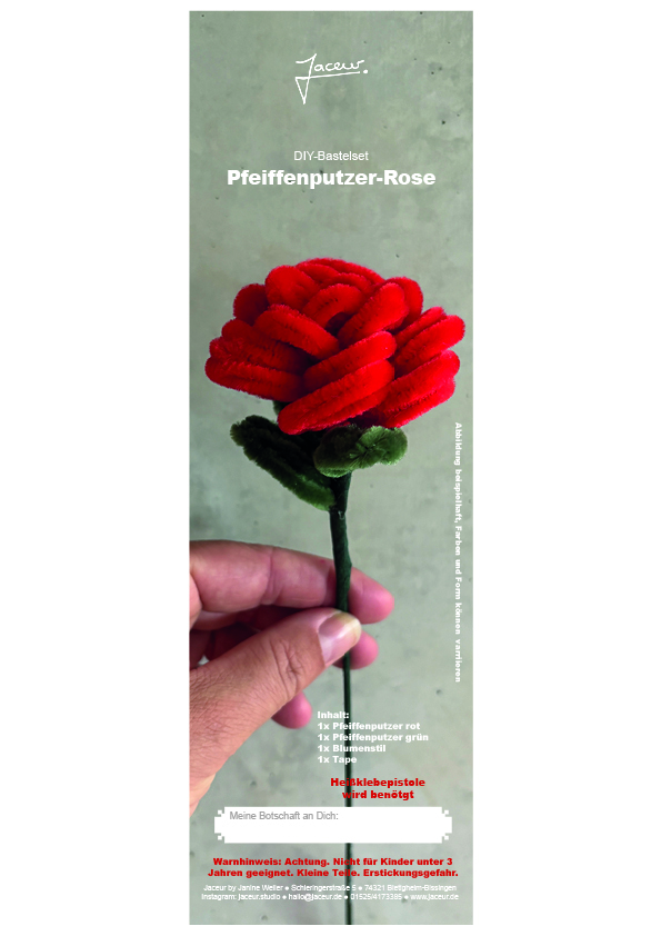 Beliebt bei Jung und Alt und als Geschenk, bieten die unterschiedlichen Jaceur Bastelsets eine benutzerfreundliche Anleitung und alle nötigen Materialien. Farbwünsche werden bei Anfrage sehr gerne berücksichtigt. Ein kleines Notizfeld ist jeweils vorhanden für eine Individualisierung durch eine persönliche Botschaft, einen Glückwunsch oder ein paar liebe Worte.