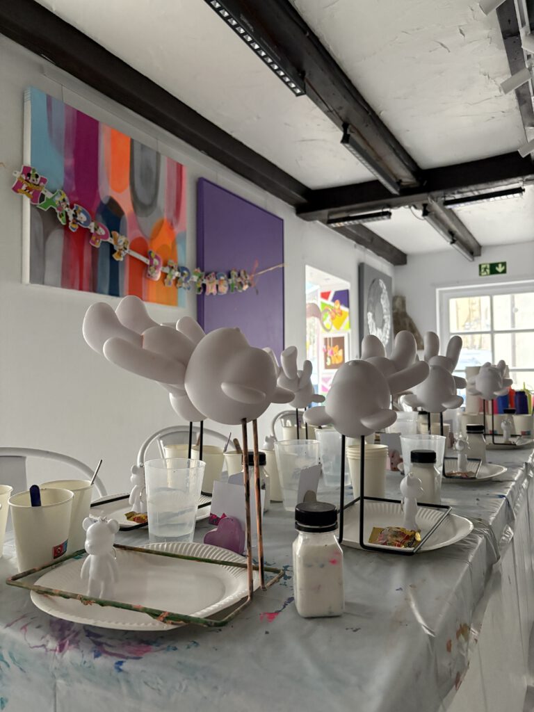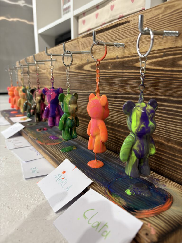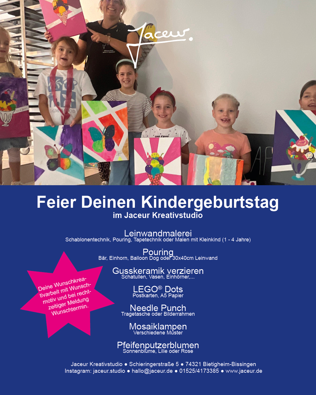 Im Gespräch vorab mit den Eltern und dem Geburtstagskind wird definiert ob Leinwandmalerei (für Kinder empfehle ich Schablonen-, Tape -, Fadentechnik, für Kinder von 1 – 4 Jahre biete ich Acrylmalen mit Kleinkind wo jeweils eine Begleitperson mitkommen sollte), Pouring (Bär, Einhorn oder Balloon Dog oder Schlüsselanhänger), Gusskeramik anmalen (große Auswahl an Schatullen und Vasen etc.) LEGO® Dots prints, Needle Punch, Pfeifenputzerblumen, Mosaiklampen etc. im Jaceur Kreativstudio gemeinsam gestaltet wird. Dies bietet den Kindern die Möglichkeit, ein individuelles künstlerisches Andenken an die Geburtstagsfeier bei Jaceur selbständig anzufertigen.